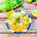 Bún nước tương nhà làm, đậu phộng, hành phi, rau sống…Topping: Đậu hủ chiên, sườn sợi chiên giòn (hoa chuối chiên), chả cốm (chả giò/heo quay ram chay)