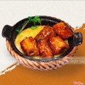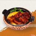Món ăn gồm có : 1 niêu cơm cháy 2 mặt, 1 phần suònw rim tiêu đen, kim chi ăn kèm , cốc canh rau thay đổi theo ngày