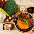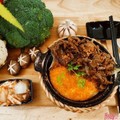 Món ăn gồm có : 1 niêu cơm cháy 2 mặt, 1 phần bò om nấm đùi gaf, kim chi ăn kèm , cốc canh rau thay đổi theo ngày