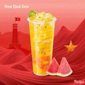Cốc sản phẩm với đầy đủ 5 loại trái cây tươi(dưa hấu, xoài, chanh dây, cam, quất) cùng trà xanh hoa nhài tạo nên hương vị đậm đà